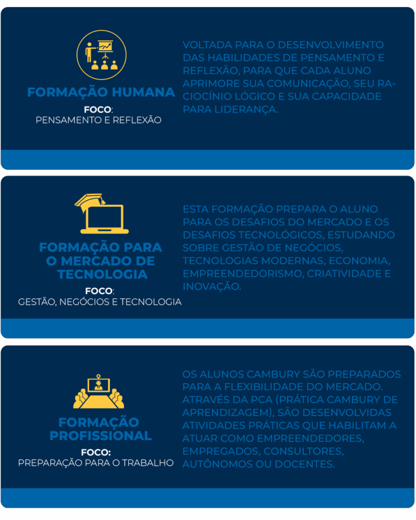 A Prática Cambury de Aprendizagem (PCA) oferece ao aluno a experiência da interação com o professor e empresa para o desenvolvimento de um projeto. Aqui o aluno vive a profissão e sai pronto para o Mercado de Trabalho.